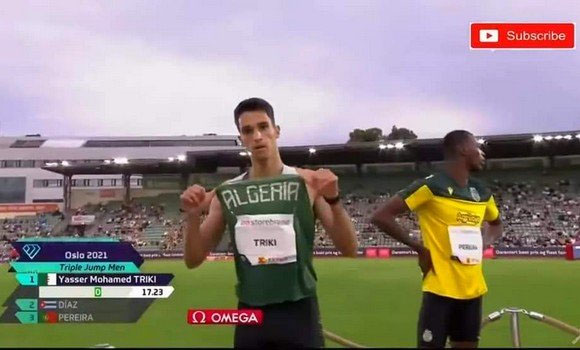 فاو العداء الجزائري ياسر محمد التريكي مساء أمس الخميس بأوسلو (النرويج) بمسابقة الوثب الثلاثي، خلال المرحلة الرابعة للدوري الماسي.