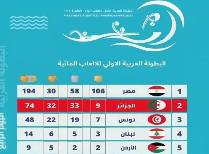 بطولة العرب للألعاب المائية 2022: الجزائر تنهي المنافسة وصيفة بـ 74 ميدالية بطولة العرب للألعاب المائية 2022: الجزائر تنهي المنافسة وصيفة بـ 74 ميدالية أنهت الجزائر مشاركتها في البطولة العربية للألعاب المائية للشباب (بين 12 و18 سنة)...المزيد...